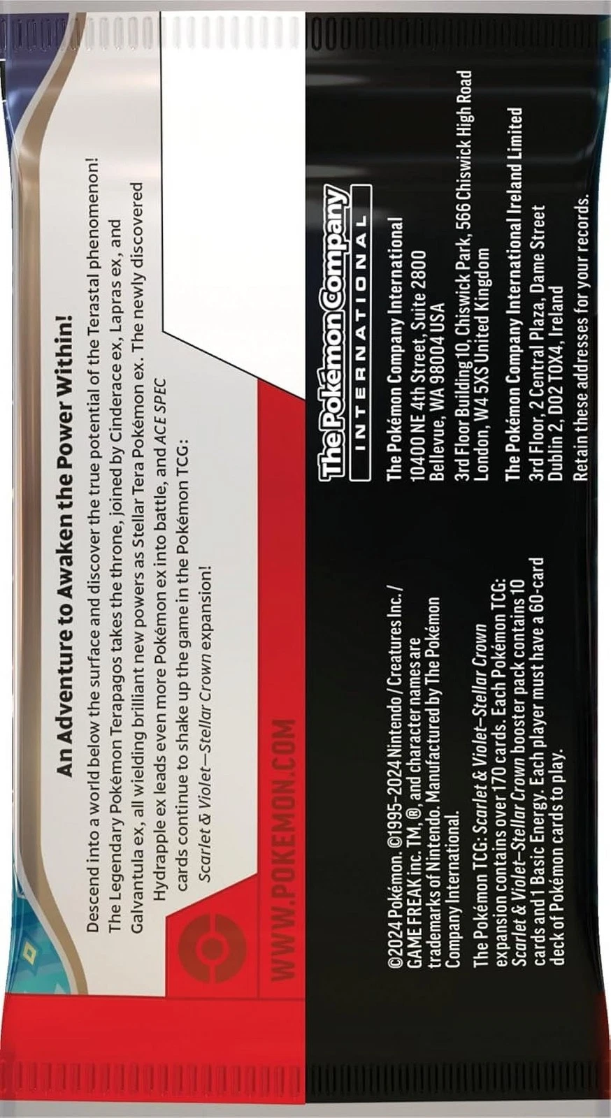 Descend into a world below the surface and discover the true potential of the Terastal phenomenon! The Legendary Pokemon Terapagos takes the throne, joined by Cinderace ex, Lapras ex and Galvantula ex, all wielding brilliant new powers as Stellar Tera Pokémon ex. The newly discovered Hydrapple ex leads even more Pokemon ex into battle and ACE SPEC cards continue to shake up the game in the Pokémon TCG: Scarlet & Violet – Stellar Crown expansion!
